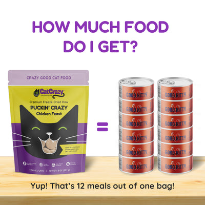 You'll find 23 to 25 pucks in every bag. 🎒 While this provides a guideline for feedingPuckin' Crazy Chicken Feastas a complete meal, the actual amount your cat needs
